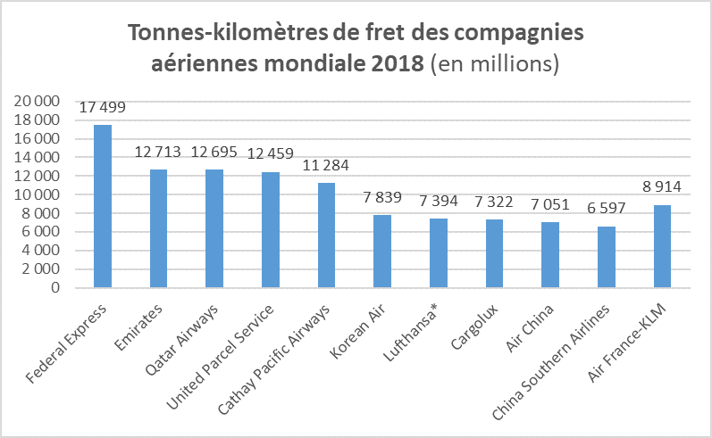 Selon IATA, le transport aérien de marchandises représente moins de 1% en volume mais plus de 35% en termes de valeur des échanges dans le monde. Le transport maritime capte plus de 90% des volumes mais demeure plus lent. Le fret aérien s’avère pertinent pour des produits haut de gamme : colis express, composants électroniques, médicaments, fleurs, chevaux de race… L’OACI[1] estime à 220 707 millions le nombre de tonnes-kilomètres transportées en 2018.